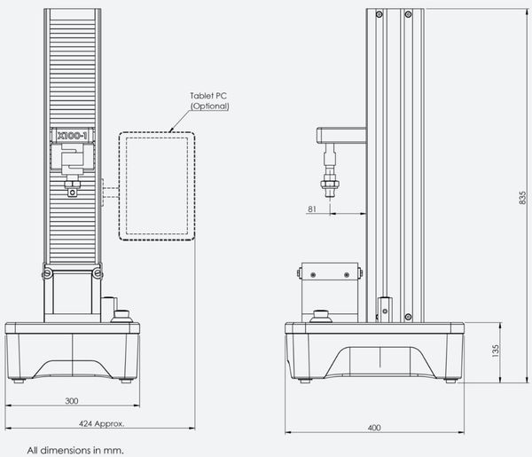 Models: X100-FTA Hành trình đầu kéo (mm) 420 mm (360 mm khi lắp đế FTB) Kết nối với PC USB qua bộ chuyển đổi Tốc độ tối đa (mm/phút) 1000 Lực kéo tối đa (kN) 1 Nguồn điện sử dụng 100V-240V, 1 pha 50/60Hz Khối lượng (kg) 25 Công suất (kW) 0.2 Loadcell đi kèm 500N hoặc 1 kN (Tùy chọn) Kích thước sản phẩm X100-FTA:
